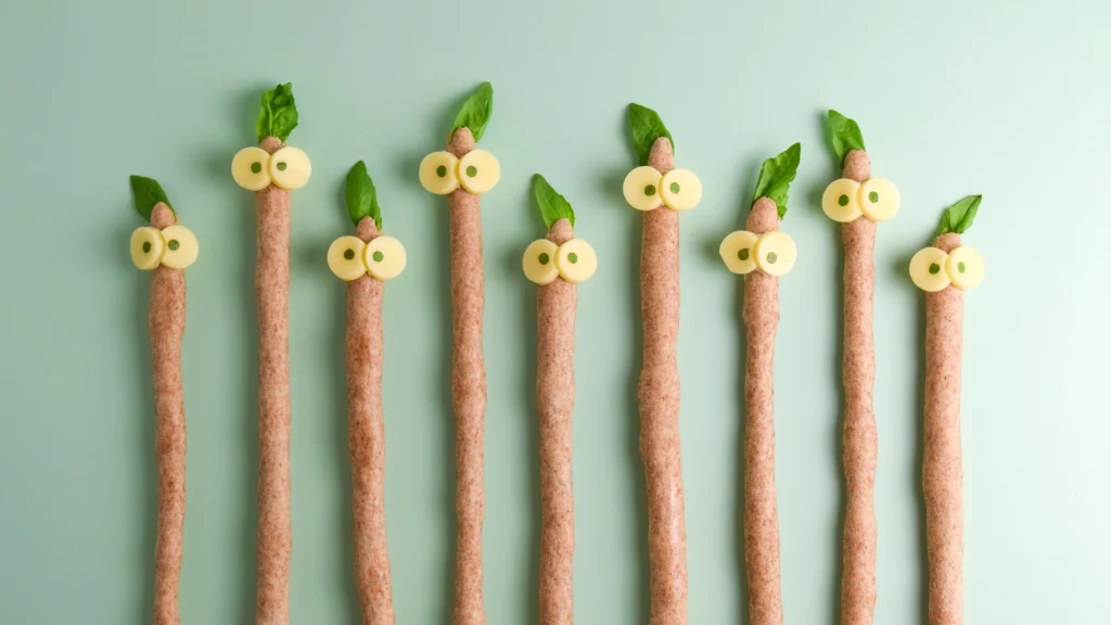 - Once completely cool, cut a slit in the top of each breadstick and use the tip of the knife to push a small basil leaf into each one.